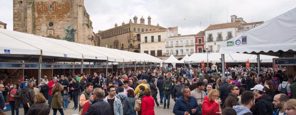 A principios de mayo, esa misma plaza señorial deja de ser un museo al aire libre y se convierte en el mercado más aromático que puedas imaginar. Cientos de puestos (sí, cientos) se instalan bajo los soportales y en el centro de la plaza. El aire huele intensamente a leche de oveja, a curado, a pimentón de la Vera y a vino de pitarra. Es la feria del queso más importante de España y el ambiente es pura alegría.